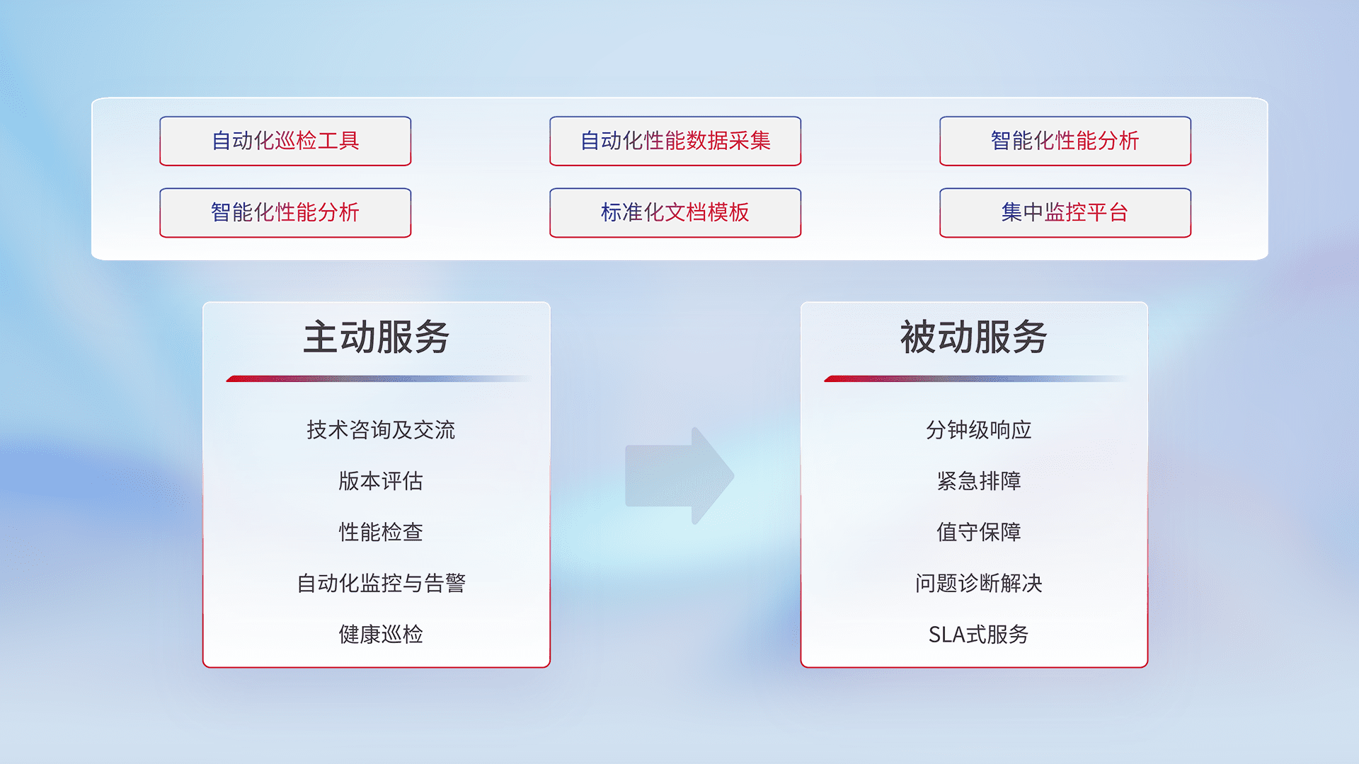 智能化工具和标准化文档,,,保障服务质量,,,,提供主动服务(包含技术咨询、、、、版本评估、、、、性能检查、、、、自动化监控与告警、、健康巡检)和被动服务包含(分钟级响应、、、紧急排障、、、、值守保障、、、问题诊断解决、、SLA服务)。。。