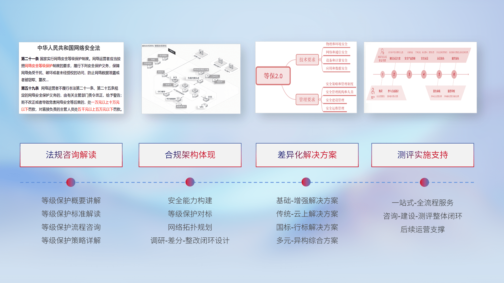通过专业的法律咨询解读、、、合规架构体现、、、、差异化解决方案、、、测试实施支持等服务,,,,为客户量身打造等保合规体系。。